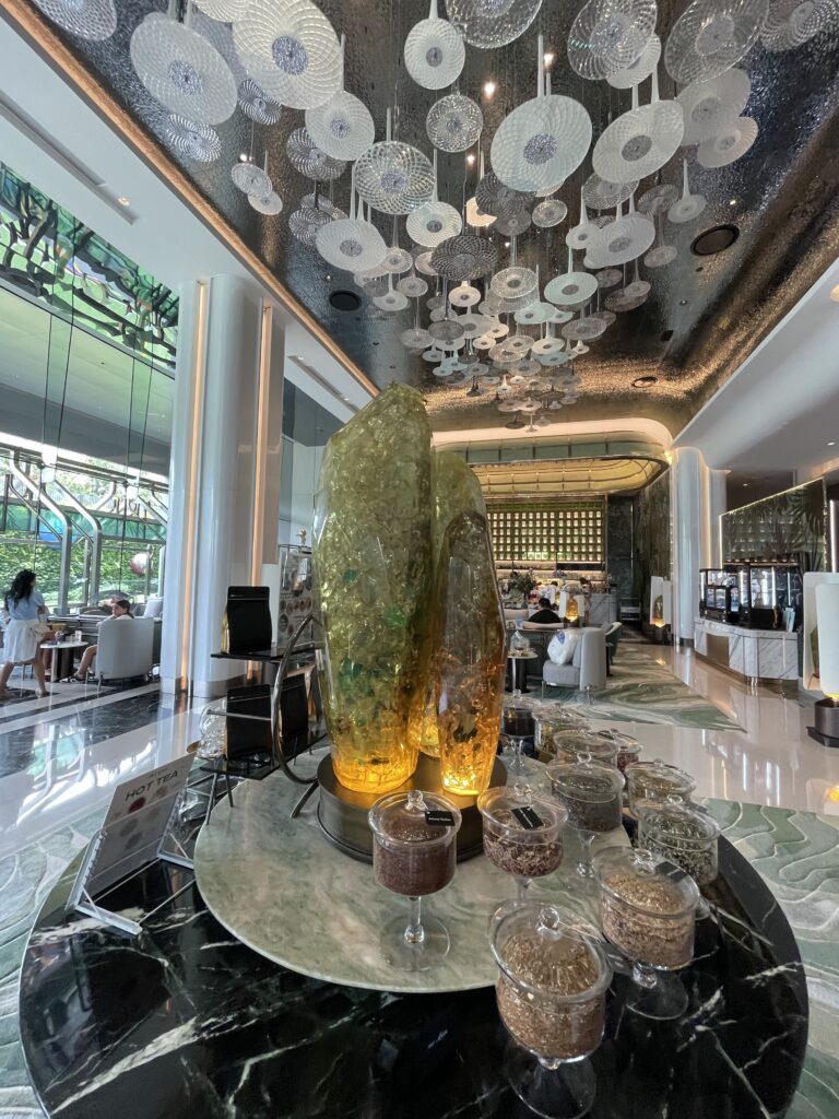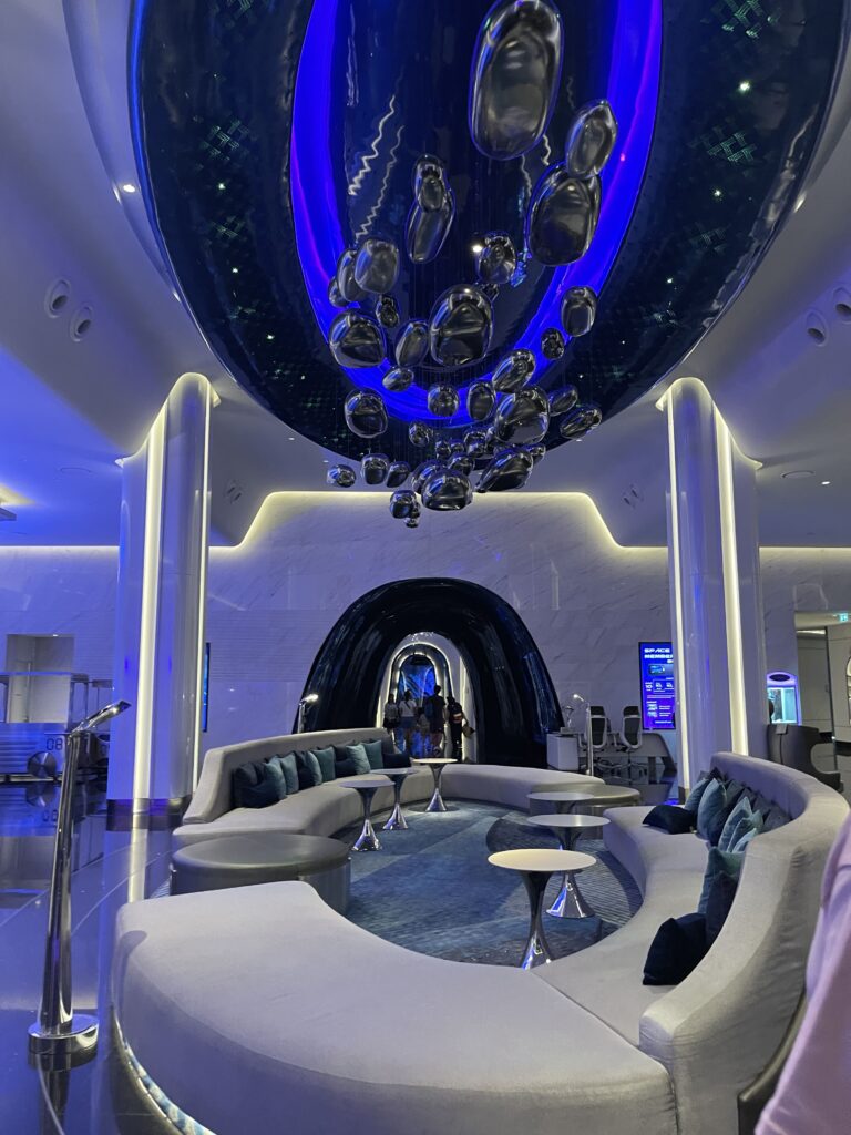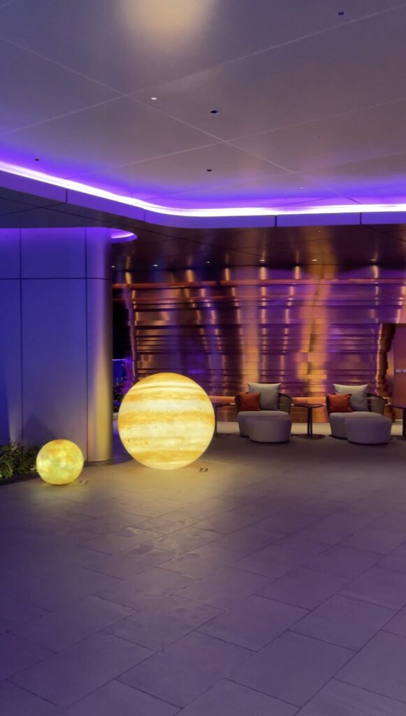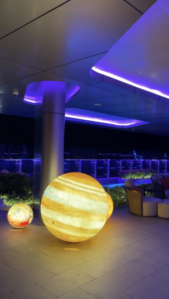 當我從電梯裡走出來看到這幅景象,真的驚呼連連,也太美了!我彷彿走進了太空艙,而天花板還是宇宙中的星空,真的太浮誇!