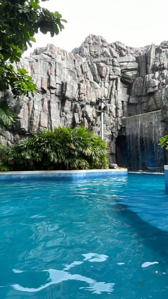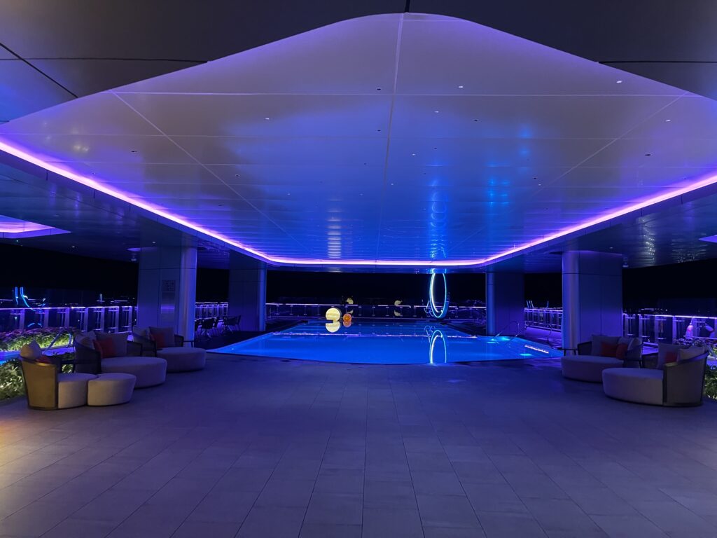 夜晚搭配燈光美到炸裂的露天泳池!(原諒我照片拍得太模糊,實際上看真的美翻!)