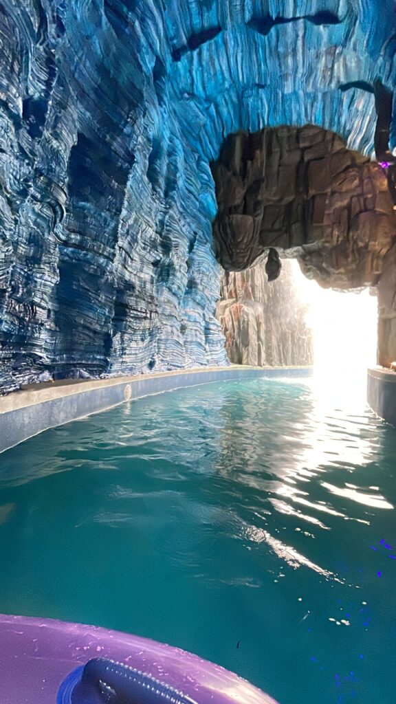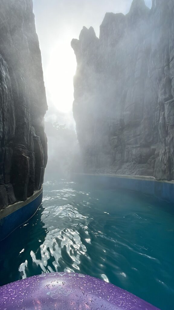 整座漂漂河的長度並不短,還會經過山洞、蜘蛛造景的水柱攻擊等等,非常好玩!甚至山洞中還有煙霧的設計,讓人感覺處於仙境,超級夢幻~