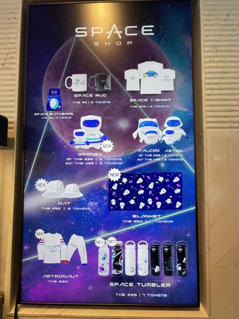 一樓大廳的櫃檯旁在賣飯店的主題商品,有太空娃娃、保溫杯、毛巾、衣服等等。